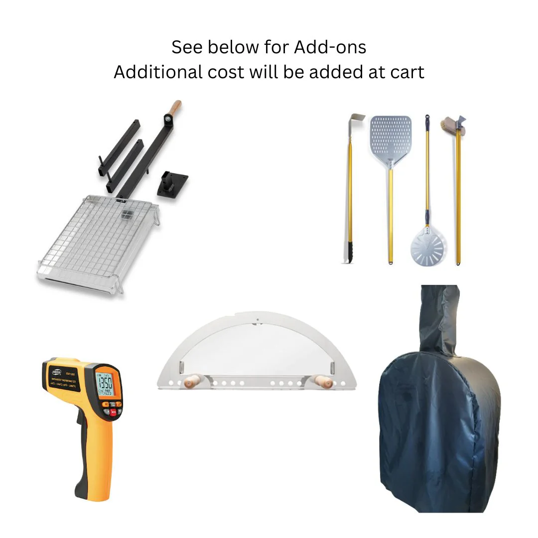 - Stainless steel chimney, thermometer, front shelf, steel oven door, refractory base, and a rod to move the firewood holder.